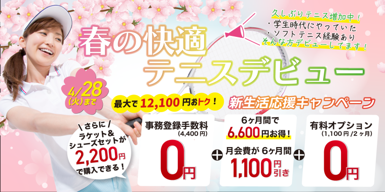 エスタ インドアテニス諏訪野店です。 この春新しい事始めませんか?「新しい趣味を見つけたい」「運動不足を解消したい」という皆様を応援する、4月限定のキャンペーンがスタートします!
